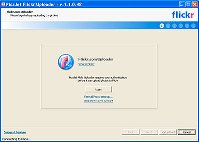 The Flickr Uploader login page appears. Click on the Login button. If this is your first time using PicaJet Flickr Uploader, you need to authorize your account. Authorizing is a simple one-off process, which takes place via your web browser when you click the Login button. When you are finished, return to PicaJet Flickr Uploader and press OK to continue.