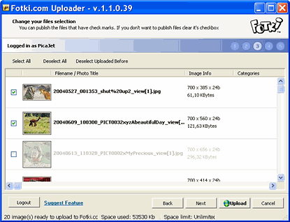 You can now upload your images by pressing the “Upload” button. Alternatively, you can deselect any images you do not wish to upload to the photo sharing service. You could, for example, deselect some images that are already uploaded. After your selection is made click on the “Upload” button to upload them or click on the "Next" button to change some of the image optimization options.